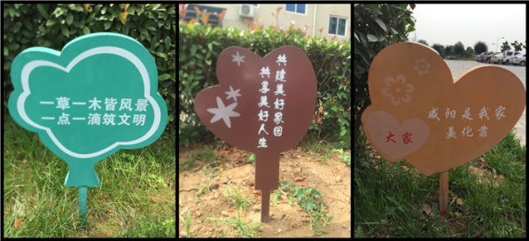 “一草一木皆風景 一點一滴筑文明”、“共建美好家園 共享美好人生”、“咸陽是我家 美化靠大家”,這些草叢中并不起眼的宣傳牌顯得既平凡又偉大,我們都應深刻體會這些語句的涵義,保護花草,踐行道德風尚,共享文明成果。