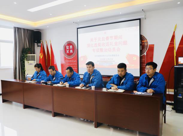 最后尹向前書記強調:公司班子成員、各部門負責人要帶頭做好表率,按照整治要求,開展自查自糾并簽訂《元旦春節期間不違規收送禮金承諾書》,堅決做到言必行、行必果,公司監察室要切實加強紀律監督,將嚴格按照市供熱燃氣服務保障中心黨委要求,采取不打招呼,明察暗訪等方式進行全方面檢查,要鞏固提升專項整治工作取得成效。
